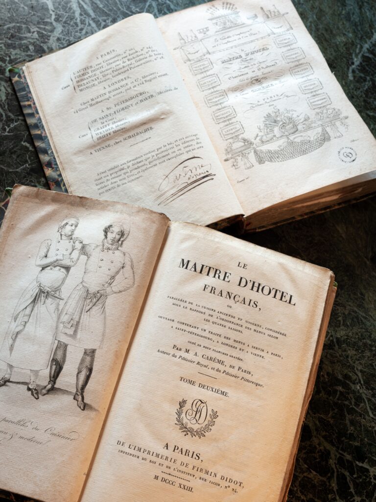 « Deux des livres du chef Antonin Carême signés de sa main, Le maître d’hôtel français et Le pâtissier pittoresque, ont été une première source d’inspiration qui allait devenir la pierre angulaire de la bibliothèque du Château Haut-Brion. Deux de mes tout premiers achats, ils représentaient l’histoire du monde, la gastronomie et, bien sûr, la diplomatie renommée de l’ancien propriétaire de Château Haut-Brion, Charles-Maurice de Talleyrand-Périgord. Je n’ai guère de doute quant au vin servi à sa table lors d’un congrès qui allait contribuer de manière significative à façonner l’Europe d’aujourd’hui ».