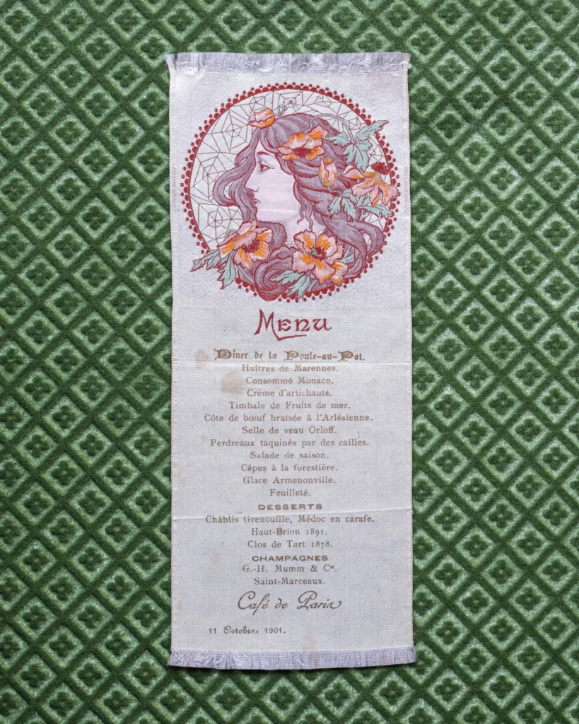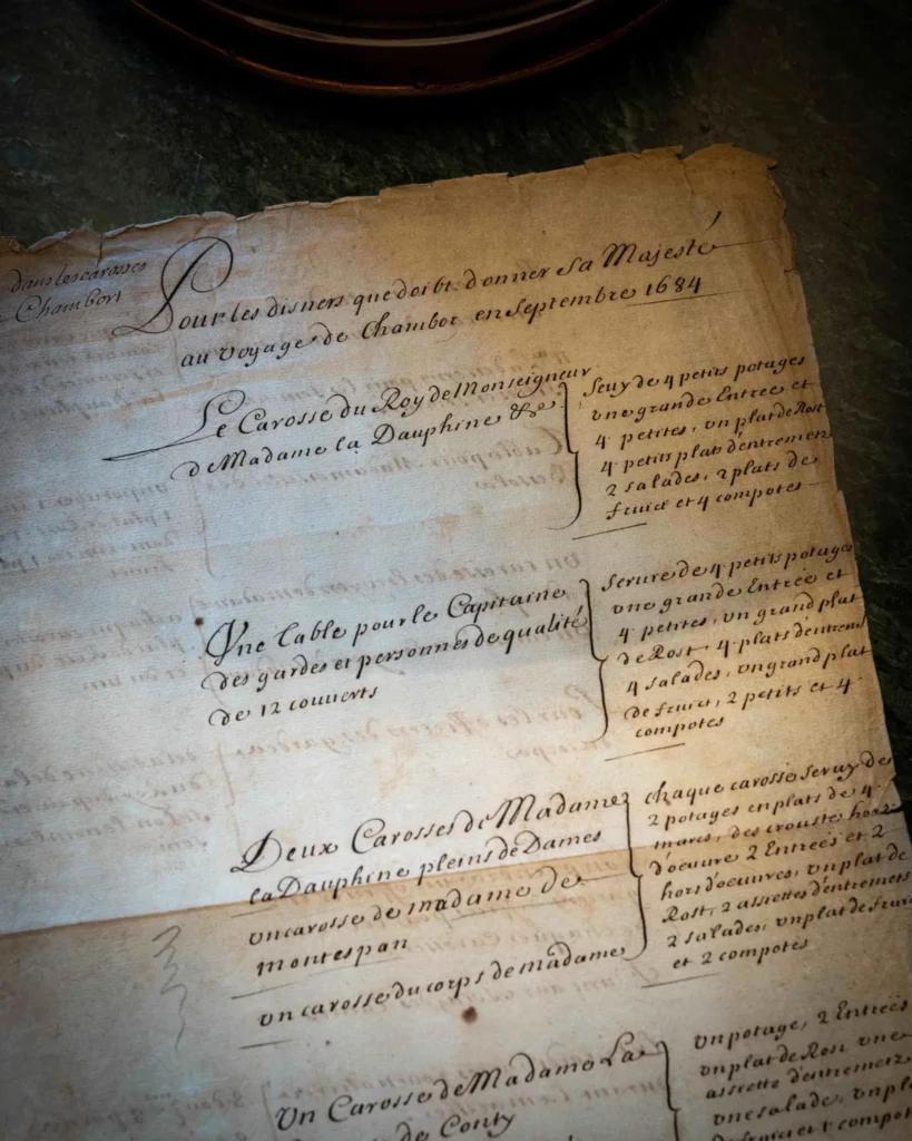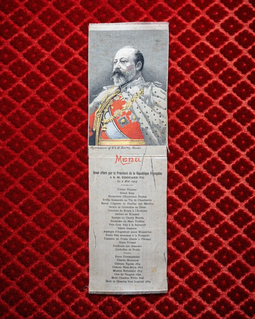 Parmi ces documents rares, on trouve notamment quatre registres manuscrits détaillant les menus servis à la table des rois Louis XIV et Louis XV au château de Versailles. Le menu sur soie d’un dîner, tenu le 2 mai 1903, offert au Roi Edouard VII par le Président français Émile Loubet, lors de la préparation des traités de l’Entente Cordiale, est également un élément remarquable de cette collection. Enfin, les deux volumes originaux du Livre de Cave de l’Élysée, sous le premier mandat de la présidence du Général de Gaulle (1959-1965), ajoutent une touche supplémentaire à cette histoire de l’art de recevoir, au cœur des plus hautes sphères du pouvoir.