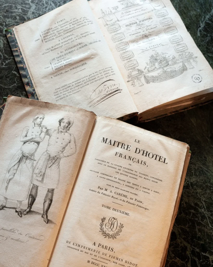 « Deux des livres du chef Antonin Carême signés de sa main, Le maître d’hôtel français et Le pâtissier pittoresque, ont été une première source d’inspiration qui allait devenir la pierre angulaire de la bibliothèque du Château Haut-Brion. Deux de mes tout premiers achats, ils représentaient l’histoire du monde, la gastronomie et, bien sûr, la diplomatie renommée de l’ancien propriétaire de Château Haut-Brion, Charles-Maurice de Talleyrand-Périgord. Je n’ai guère de doute quant au vin servi à sa table lors d’un congrès qui allait contribuer de manière significative à façonner l’Europe d’aujourd’hui».
